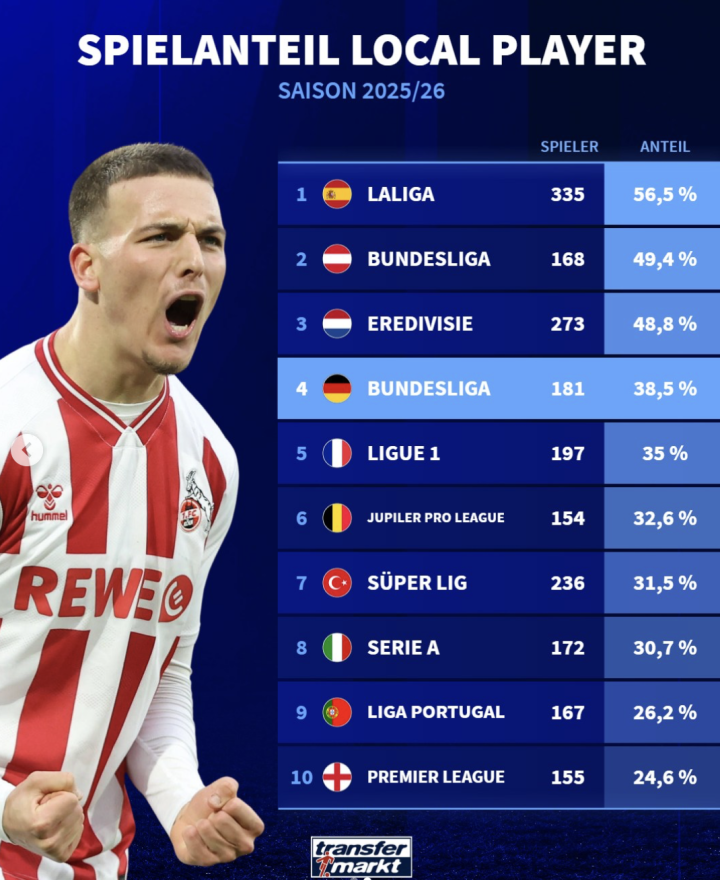 虎扑04月09日讯德转统计了欧洲各联赛本土球员占比。