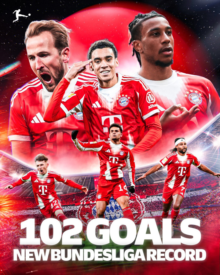 随后,格雷茨卡的进球将这一数字改写为102球,帮助拜仁正式超越这项由自己保持了54年的旧纪录,独占德甲历史第一。紧接着,奥利塞再下一城,把拜仁本赛季联赛总进球数进一步扩大到103球,继续刷新新的历史标杆。