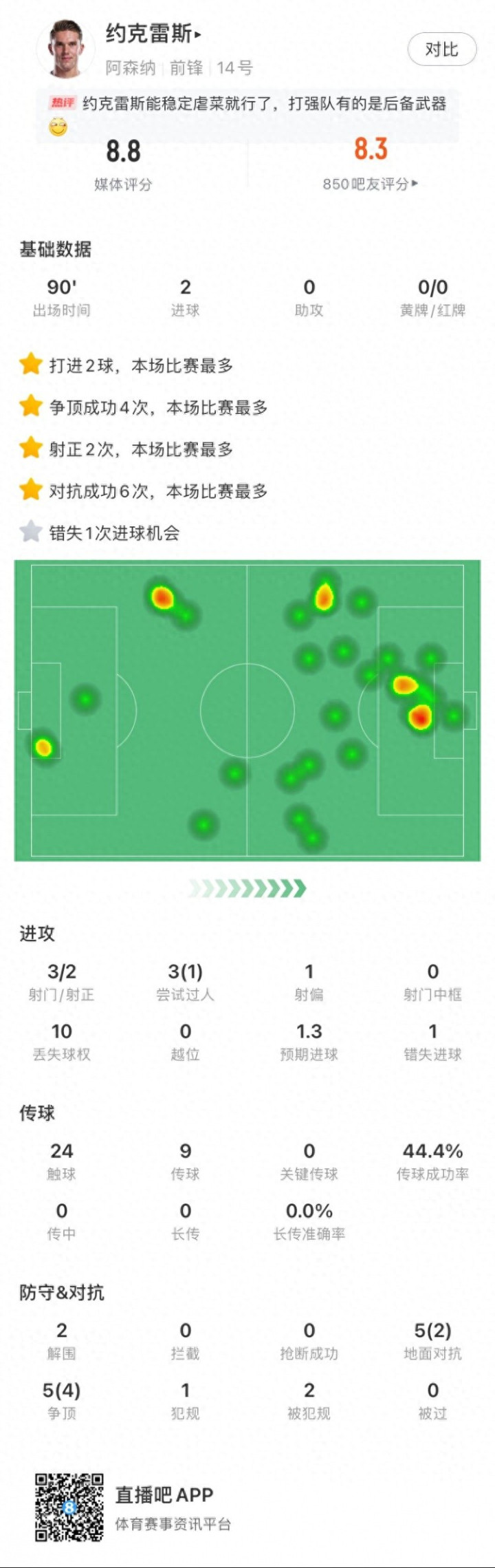 证明自己! 约克雷斯本场数据: 2进球, 1次过人, 1次错失进球机会