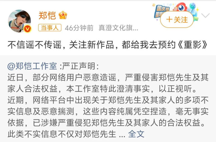 郑恺工作室也迅速及时否认,这些传闻都是有人恶意造谣、凭空捏造,已经让律师全面取证,传播这类不实消息的人立即删除已发布内容。