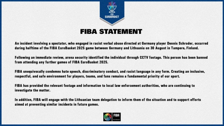 FIBA官方声明中表示:“FIBA明确谴责任何形式的仇恨言论、歧视行为和种族主义言论。为球员、球队和球迷创造一个包容、尊重和安全的环境,始终是我们的首要任务。FIBA已将相关录像和信息提供给当地执法部门,将继续调查此事。此外,FIBA将于立陶宛男篮接触,告知他们相关情况,并支持为了防止未来比赛中发生类似的事件而努力。”