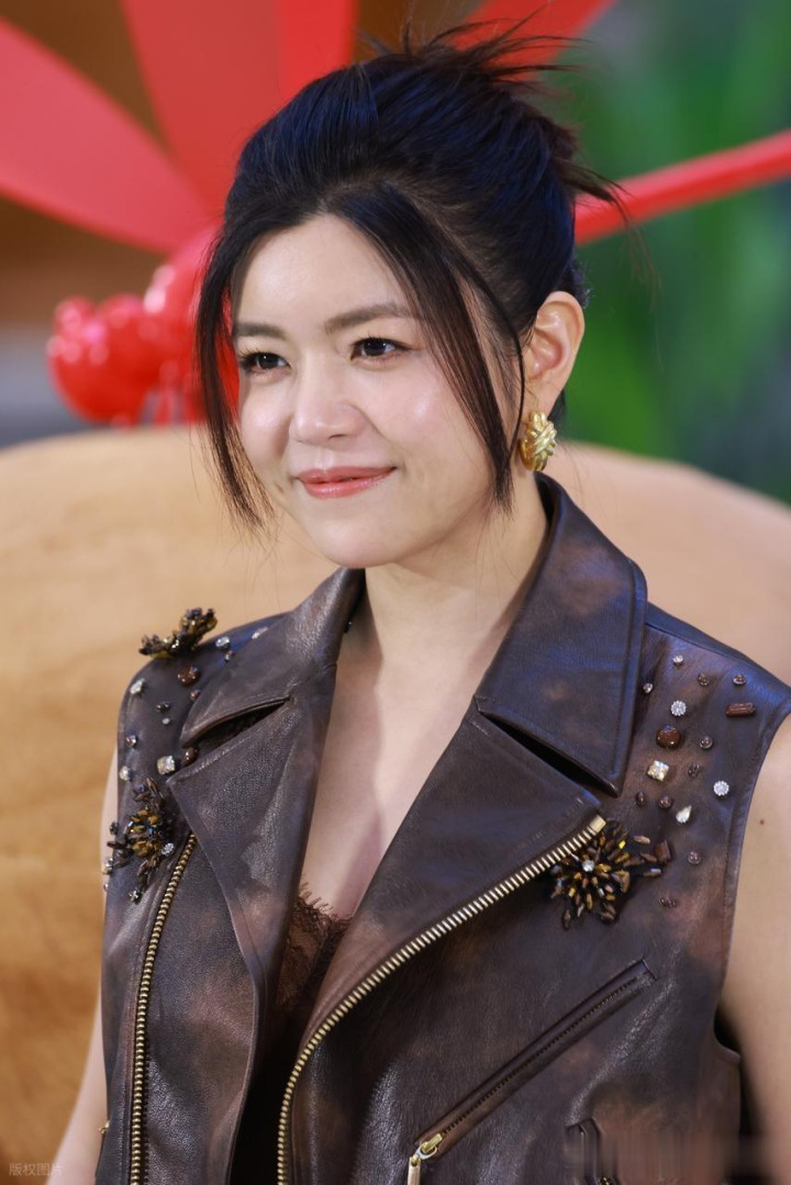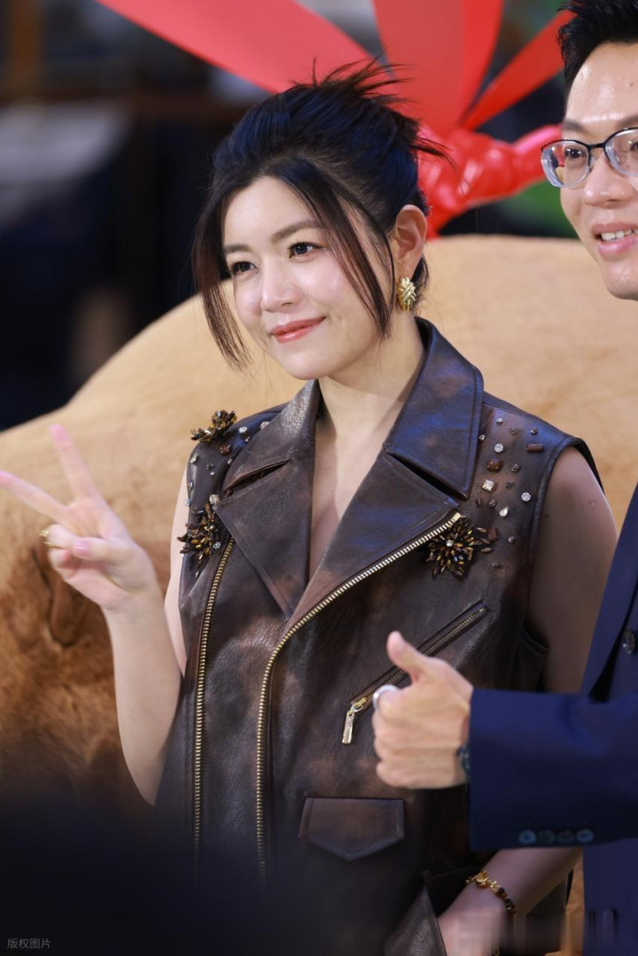 陈妍希出席品牌活动, 身穿棕色皮马甲酷飒十足