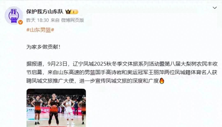 球场外,近日高诗岩也接受了一项新任务,“2025秋冬季文体旅系列活动暨第8届大梨树农民丰收节启幕”,高诗岩,和奥运冠军王丽萍两位“凤城籍的体育名人”获聘成为“凤城文旅推广大使”,赛场内外,这位山东队的“顶薪先生”够忙啦。