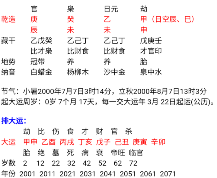 2011年进入乙酉大运,乙庚合,导致庚不生癸,贪合忘生,酉给申增力,大运构成七杀克比肩,兄弟有损。