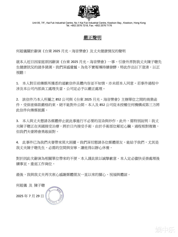 何超仪的丈夫陈子聪在二零二二年因主动脉撕裂,曾经历生死考验。虽经多次手术和积极治疗,身体状况有所好转。但就在上个月底,何超仪突然发表声明,表示因丈夫健康突发变故,需赴美国接受手术治疗,因此辞演了原定八月十日在台湾台东参加的音乐会。这一消息当时引发外界对陈子聪健康状况的高度关注。