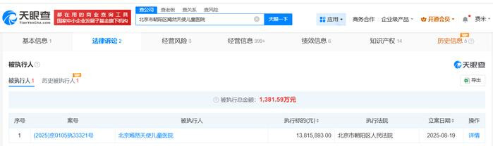 据天眼查显示,8月19日,北京市朝阳区嫣然天使儿童医院新增一则被执行人信息,执行标的1381万余元,执行法院为北京市朝阳区人民法院。