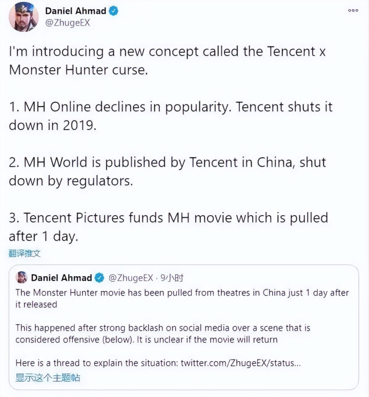 在接连经历了网络游戏和单机游戏市场的挫折之后,腾讯似乎逃不开“怪物猎人”这个IP的魔咒,在腾讯投资的《怪物猎人》真人电影又因台词问题在中国市场上映首日即被大规模下架,次日中国院线更是全部撤档。