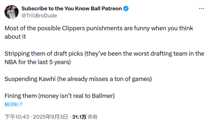 美媒Subscribe to the You Know Ball Patreon更新社媒,他写道:“想到快船可能面临的处罚,其实挺好笑的:-剥夺选秀权:过去5年他们本来就是NBA最差的选秀球队;-禁赛莱昂纳德:他反正已经缺席了无数场比赛;-罚款:对鲍尔默来说钱根本不是问题。”