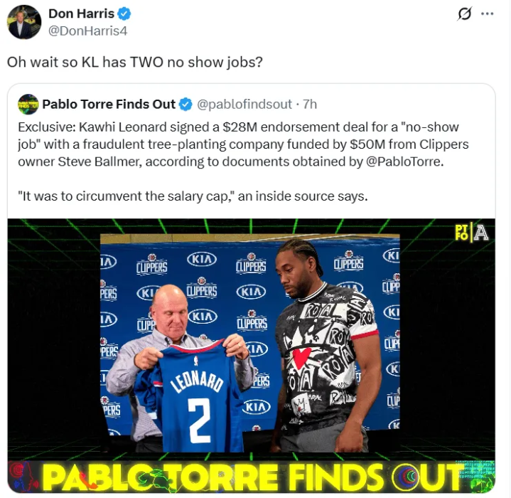 另一位美国记者Don Harris更新社媒,对莱昂纳德进行了调侃。Don Harris写道:Oh wait so KL has TWO no show jobs?(所以莱昂纳德有两份都不用露面出席的工作?)
