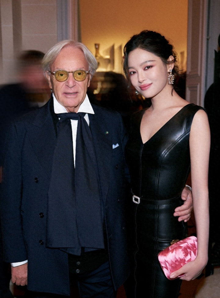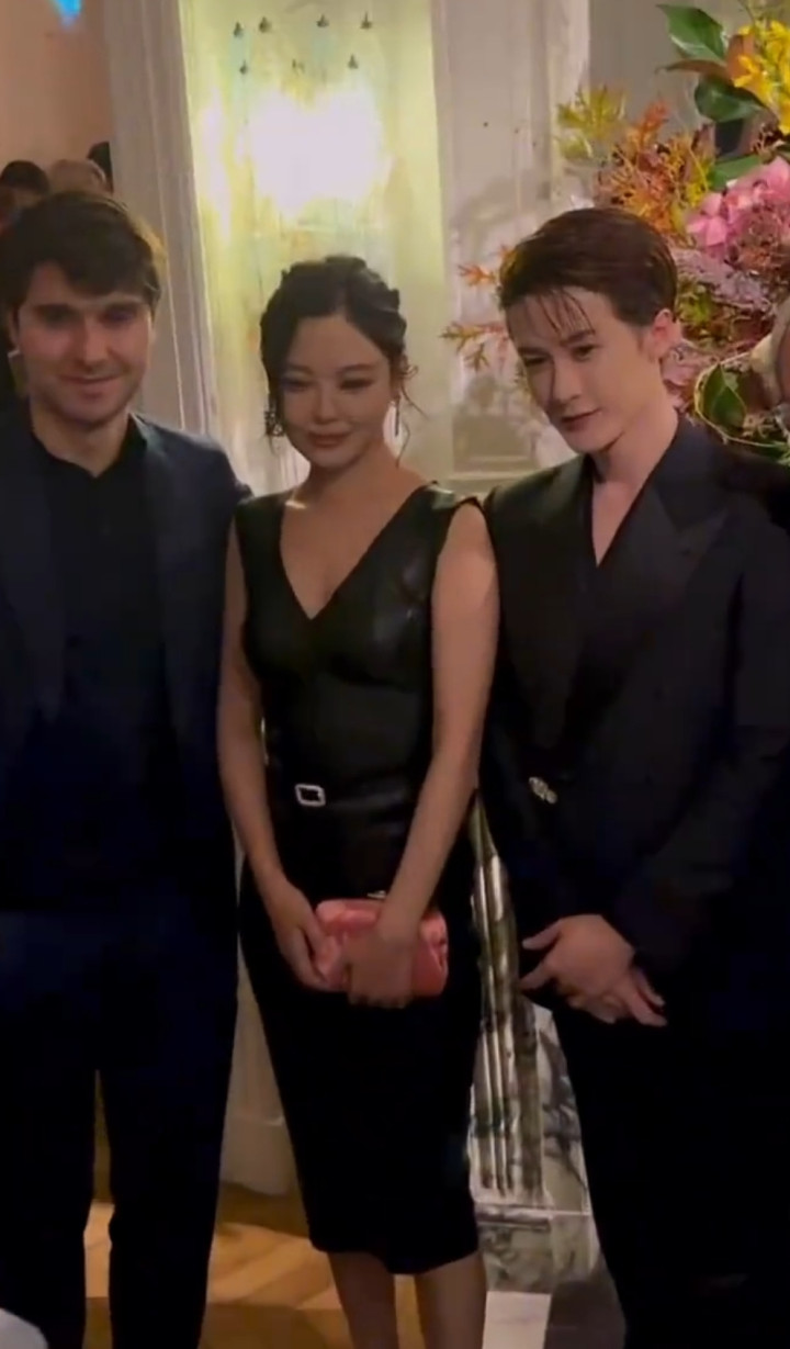> 辛芷蕾亮相巴黎时装周, 穿黑色V领皮裙, 干练优雅, 影后就是影后