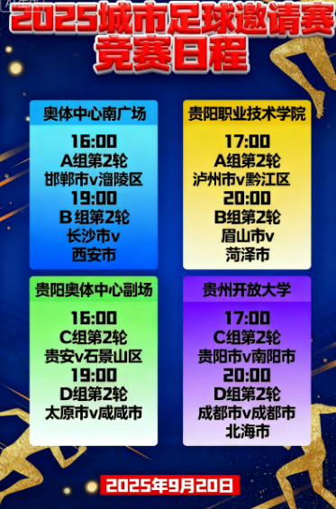 9月20日,城超迎来小组赛第二轮较量,全天共进行八场分组对决,比赛分布于贵阳奥体中心及其副场、贵阳职业技术学院和贵州开放大学四个赛场,从下午持续至晚间,为广大球迷提供丰富的观赛选择。