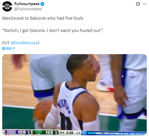 另外比赛最后时刻,威少主动保护队友的举动令人动容——比赛还剩2分多钟,威少对身背5犯的小萨喊到:来换防,我来防字母哥,我不想看到你犯满离场。