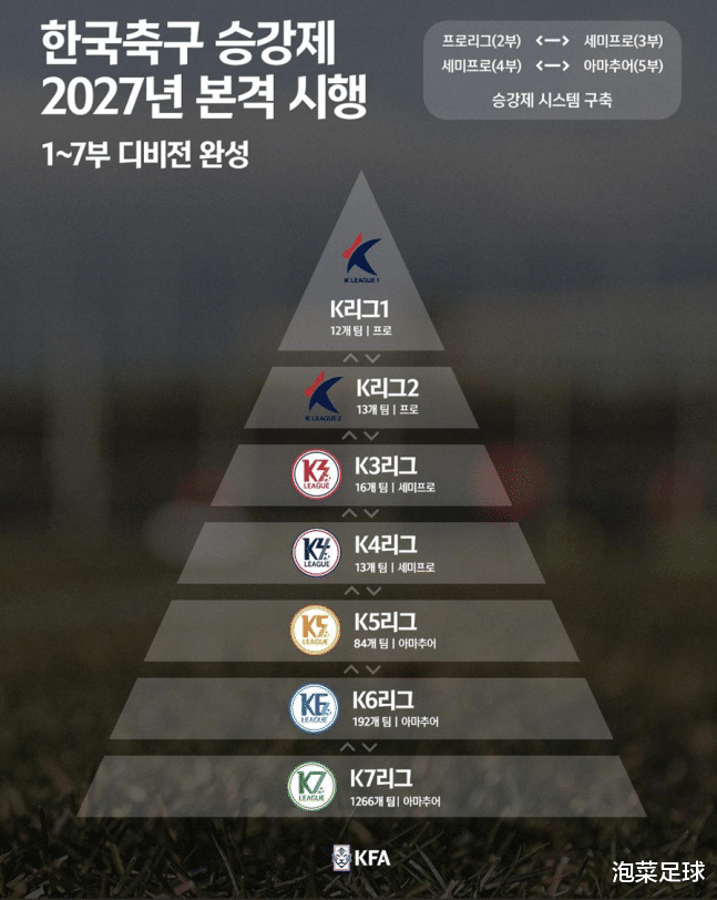 如果你以为这就是郑梦奎“金字塔体系”的全部,那就大错而特错了,这仅仅是个开始。根据郑梦奎的计划,K1和K7是要像德国和英格兰那样全线打通的,所以郑梦奎的终极目标是在2027年将K联赛打造为K1~K7全线升降级的贯通联赛,即:每一级别都有升级的可能。不过相比于德国和英格兰,韩国面临一个基础性的问题,那就是条件和资格。不说K4~K7的俱乐部,单说现在已经留在K3的俱乐部,没有一支球队具备职业资格。而想要成为职业队的球队,已经通过“政府支持+资金注入”变身K2的参赛队,这样一来,K3联赛实际上是没有升级的资格的。那么,1~7级大联赛这个环节如何打通呢?毕竟K1和K2是职业,K3是半职业,缺乏相应的条件, 这是硬伤。