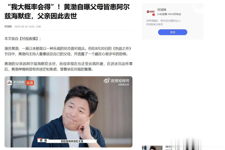 据悉,黄渤父亲早些年因阿尔兹海默症去世,并且病情十分严重,甚至都忘了他这个儿子。