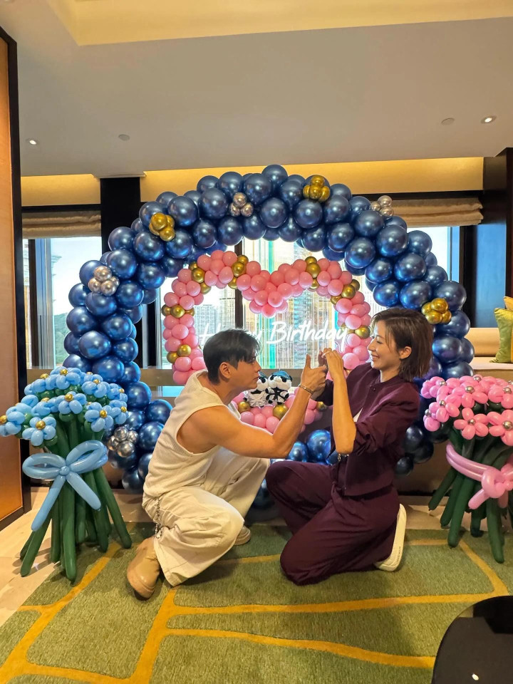 两人坐在气球背景墙前合影,罗仲谦搂着杨怡,杨怡对镜比心,夫妇俩面对笑容,看起来好幸福,男帅女美,超养眼呀。