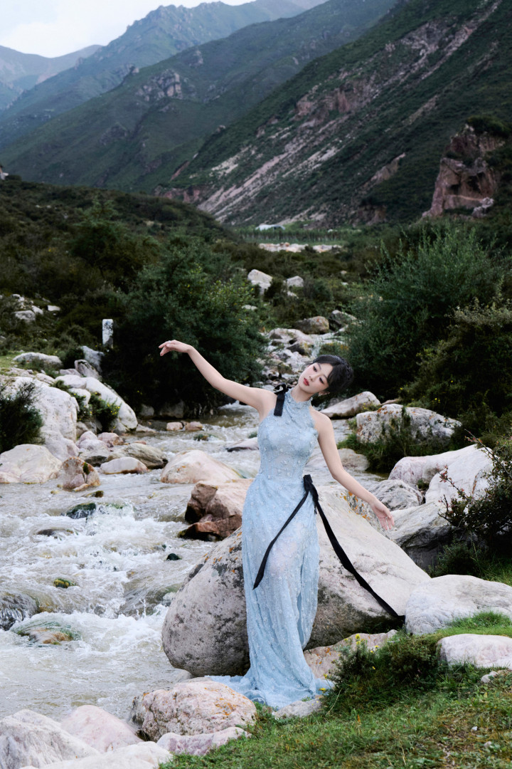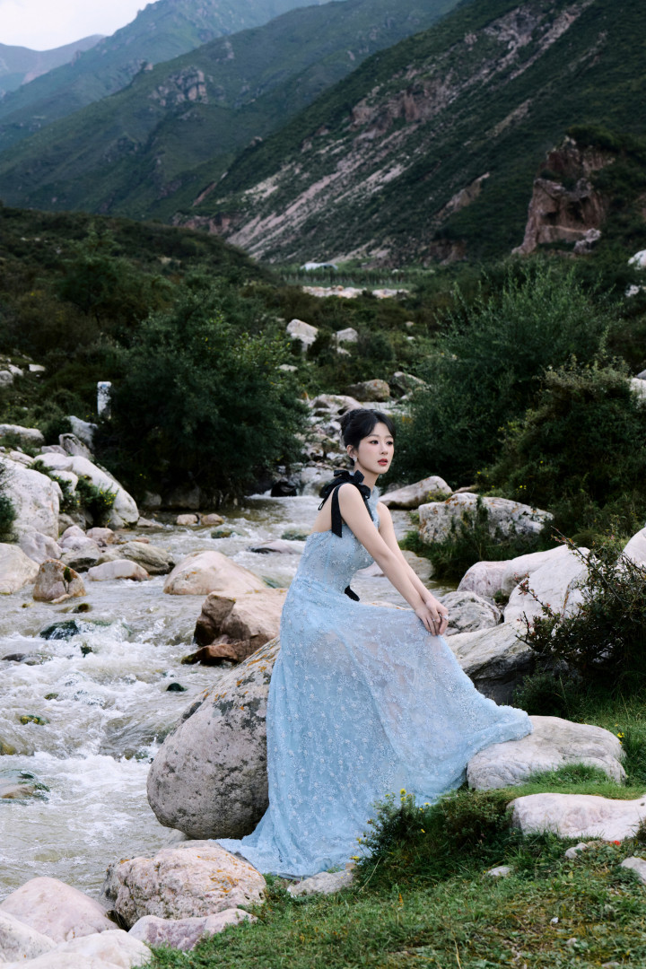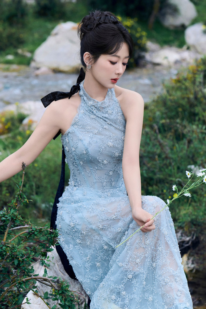 杨紫林间精灵下凡!浅蓝礼裙映溪水,青石旁柔美发光