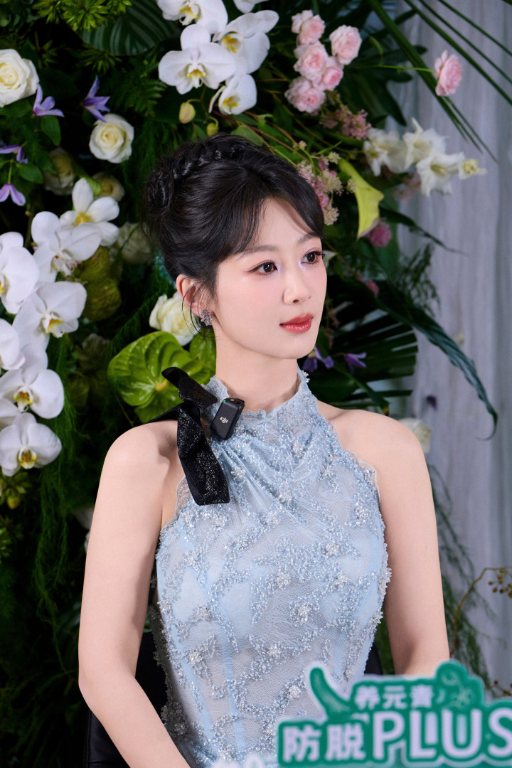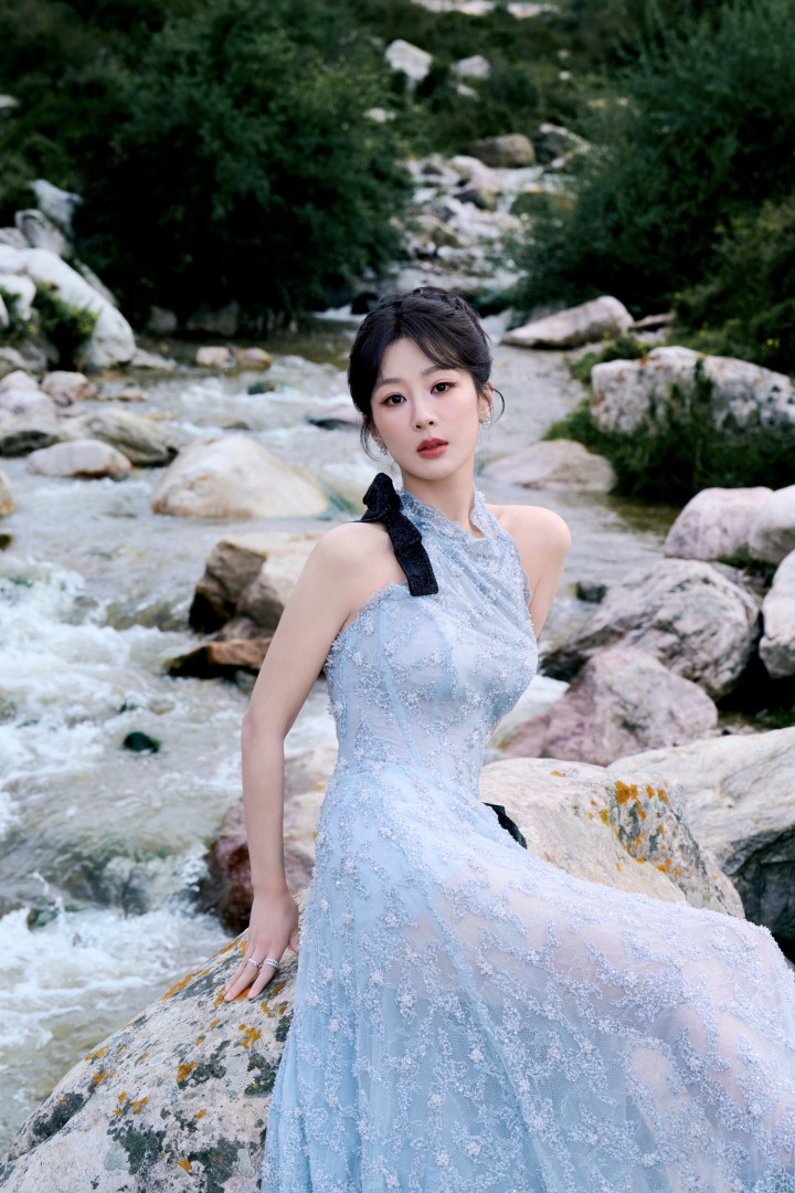 杨紫林间精灵下凡! 浅蓝礼裙映溪水, 青石旁柔美发光